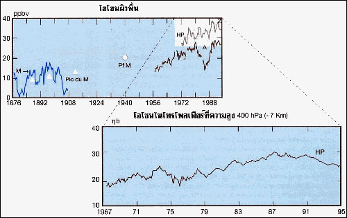 รูปที่ 16 โอโซนผิวพื้นจากสถานี Montsouris (M) และPic du Midi (D )สำหรับ50 ปีหลังของศตวรรษที่ 19 น้อยกว่าครึ่งหนึ่งของปลายศตวรรษที่ 20 ซึ่งวัดที่สถานี Hohenpeissenberg (HP) Arkona (A) Zugspitze (Z) และ Pic du Midi (D) แสดงให้เห็นชัดว่าโอโซนในโทรโพสเฟียร์เพิ่มขึ้นในซีกโลกเหนือที่ความกด 400 hPa (ประมาณ 7.2 กม.)