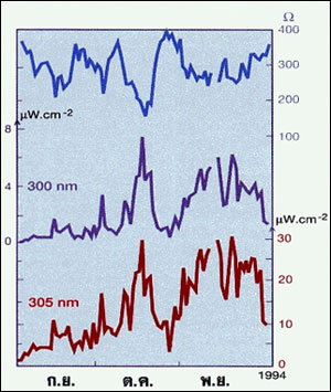 รูปที่ 18 ระหว่างเดือนกันยายนถึงเดือนพฤศจิกายน 1994 รูรั่วโอโซนขยายไปถึง Ushuaia (55 องศาใต้) ปริมาณรังสีอัลตราไวโอเลต ที่ส่องถึงพื้นจะกลับกันกับค่าโอโซนที่วัดได้เหนือศีรษะ สังเกตกลางเดือนตุลาคม ปี 1994 ณ วันที่ 17 ตุลาคม วัดโอโซนได้ 151 มิลลิ บรรยากาศ เซนติเมตร(ลดลง 60 เปอร์เซ็นต์) และพบว่ารังสีอัลตราไวโอเลตชนิดบี ที่ 305 นาโนเมตร(nm) วัดได้เกือบ 30 ไมโครวัตต์ต่อตารางเซนติเมตร และที่ 300 นาโนเมตรวัดได้เกือบ 8 ไมโครวัตต์ต่อตารางเซนติ