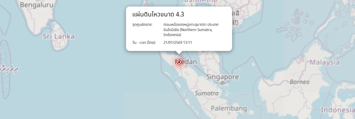 แผ่นดินไหว ตอนเหนือของหมู่เกาะสุมาตรา ประเทศอินโดนีเซีย (Northern Sumatra, Indonesia) ขนาด 4.3