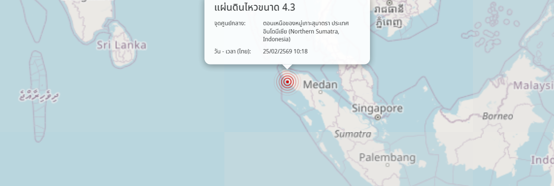 แผ่นดินไหว ตอนเหนือของหมู่เกาะสุมาตรา ประเทศอินโดนีเซีย (Northern Sumatra, Indonesia) ขนาด 4.3